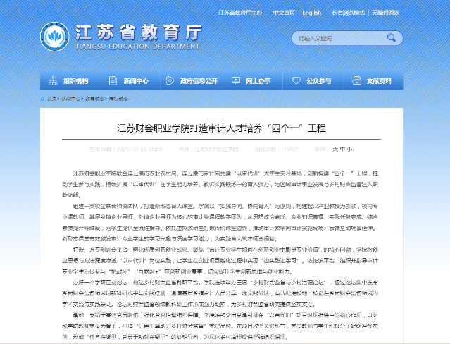 江苏财会职业学院联合连云港市农业农村局、连云港市审计局共建“以审代训”大学生实习基地,创新构建“四个一”工程,推动学生参与实践,持续扩展“以审代训”在学生能力培养、教师实践锻炼中的育人张力,为区域审计事业发展与乡村财会监督注入职教动能。