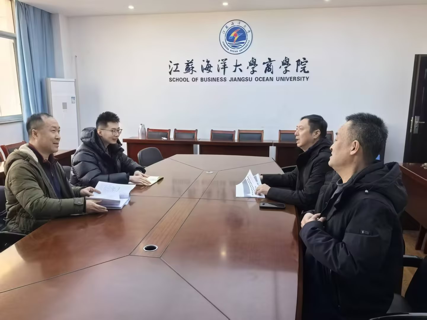日前,在我校承担的江苏省内部审计协会 2025-2026 年度一般课题即将进入中期检查之际,我校承担该项课题研究任务的教师来到江苏海洋大学商学院,就课题研究形成的阶段性研究成果进行研讨,旨在吸收同行专家建议,提升课题研究成果质量。江苏海洋大学商学院书记万金店、教授孙军,连云港内部审计协会副会长朱云山等出席研讨。