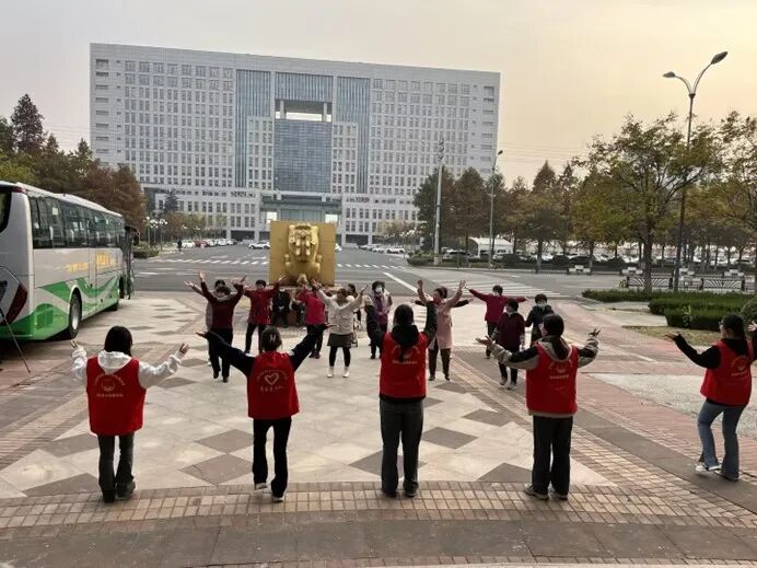 广场上,伴随着欢快轻松的音乐节拍,志愿者们带领老年人朋友一起跳起了健身操,每一位参与的老人都非常认真、开心,现场欢声笑语,非常和谐。