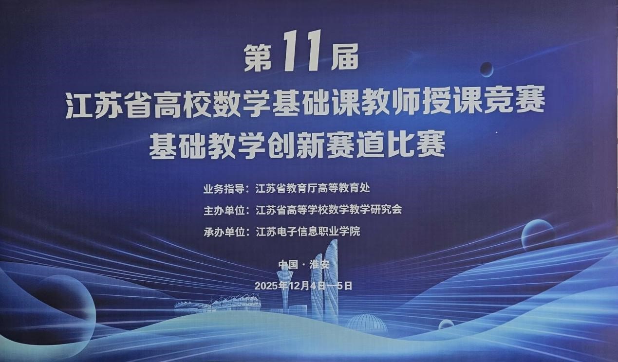 12月5日,由江苏省教育厅高等教育处指导、江苏省高等学校数学教学研究会主办、江苏电子信息职业学院承办的江苏省高校第十一届数学基础课教师授课竞赛基础教学创新赛道比赛圆满结束,我校基础教育学院苏永刚、陈文昊、郭子旗、夏云四位老师组成的参赛团队荣获三等奖。