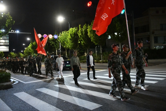 行进途中,新生们步伐坚定、口号响亮。尽管夜色深沉,他们始终保持着整齐的队形,展现出良好的纪律性与凝聚力。街道旁的路灯将他们的身影拉长,迷彩服上的汗水是他们青春拼搏的印记,手中的红旗则是他们信念与担当的象征。